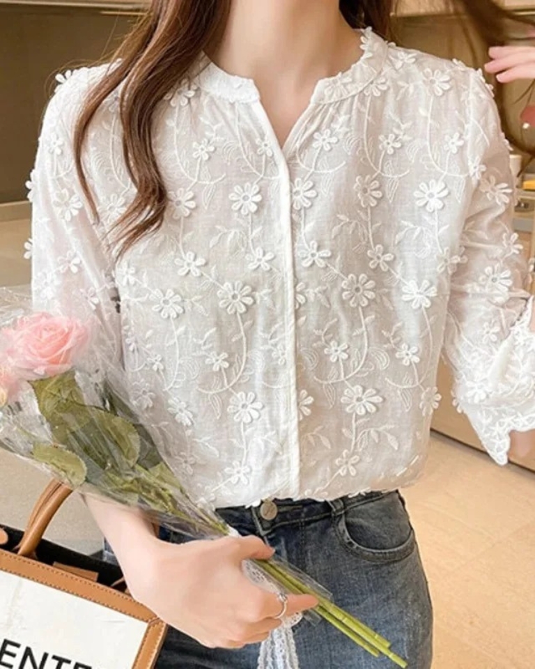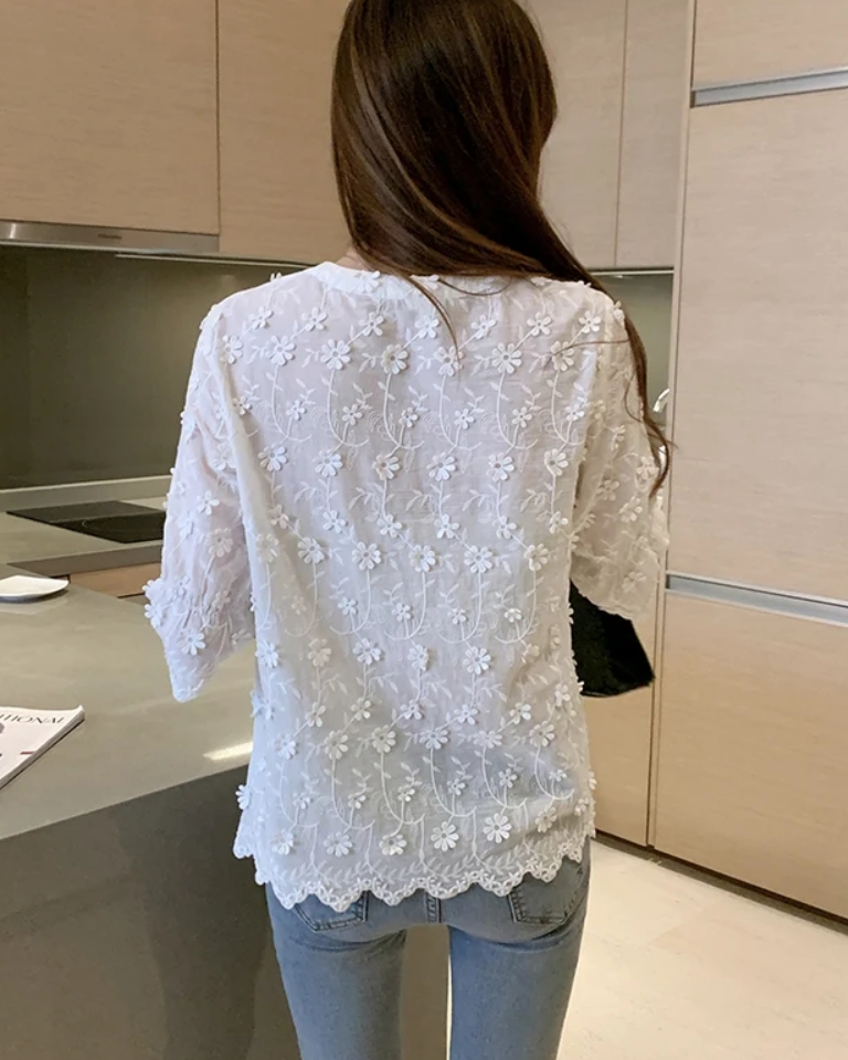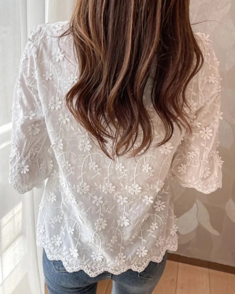 Cette blouse blanche en dentelle apporte une touche romantique et raffinée à votre style.