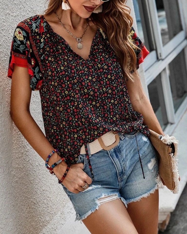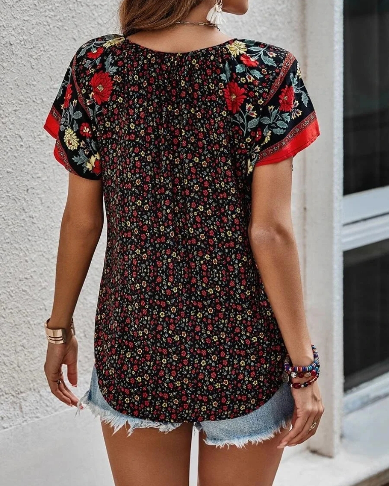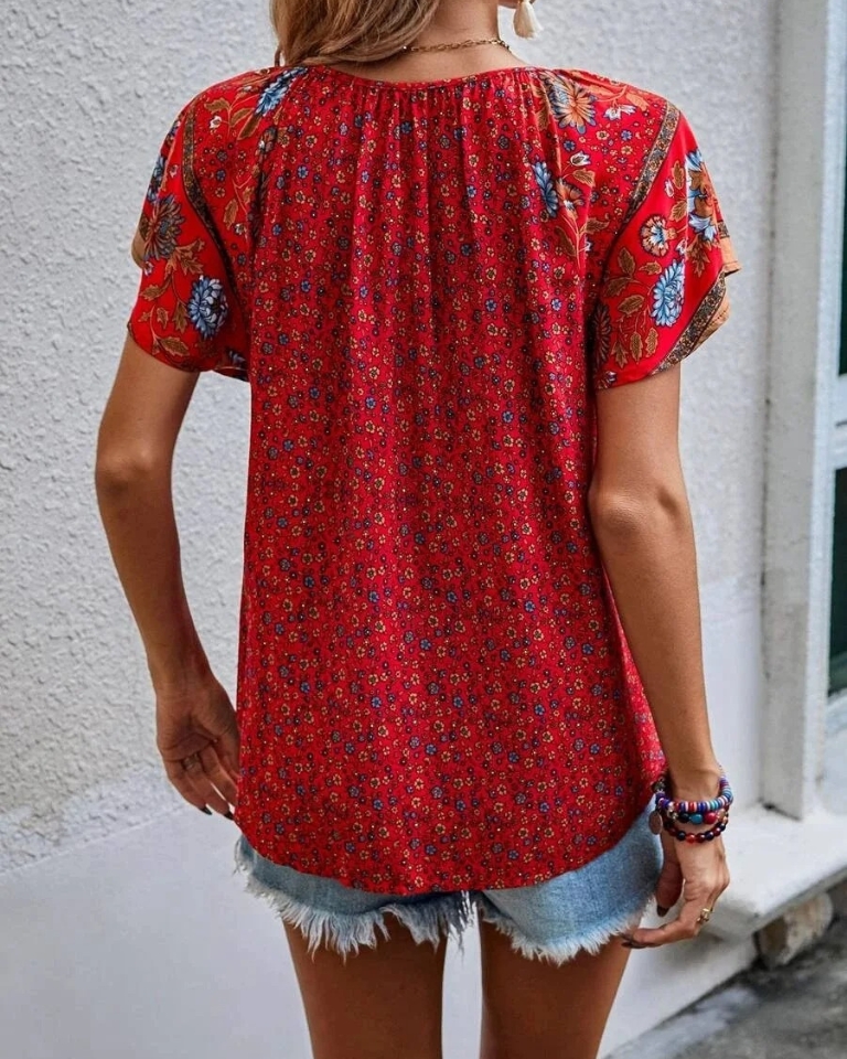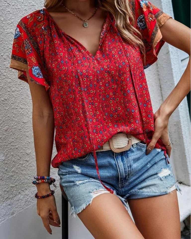 Adoptez le style avec ce chemisier imprimé à manches courtes et col en V. Parfait pour un look décontracté-chic et féminin au quotidien.