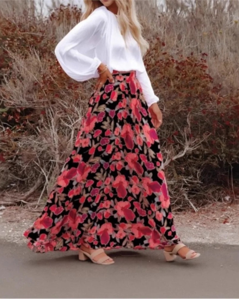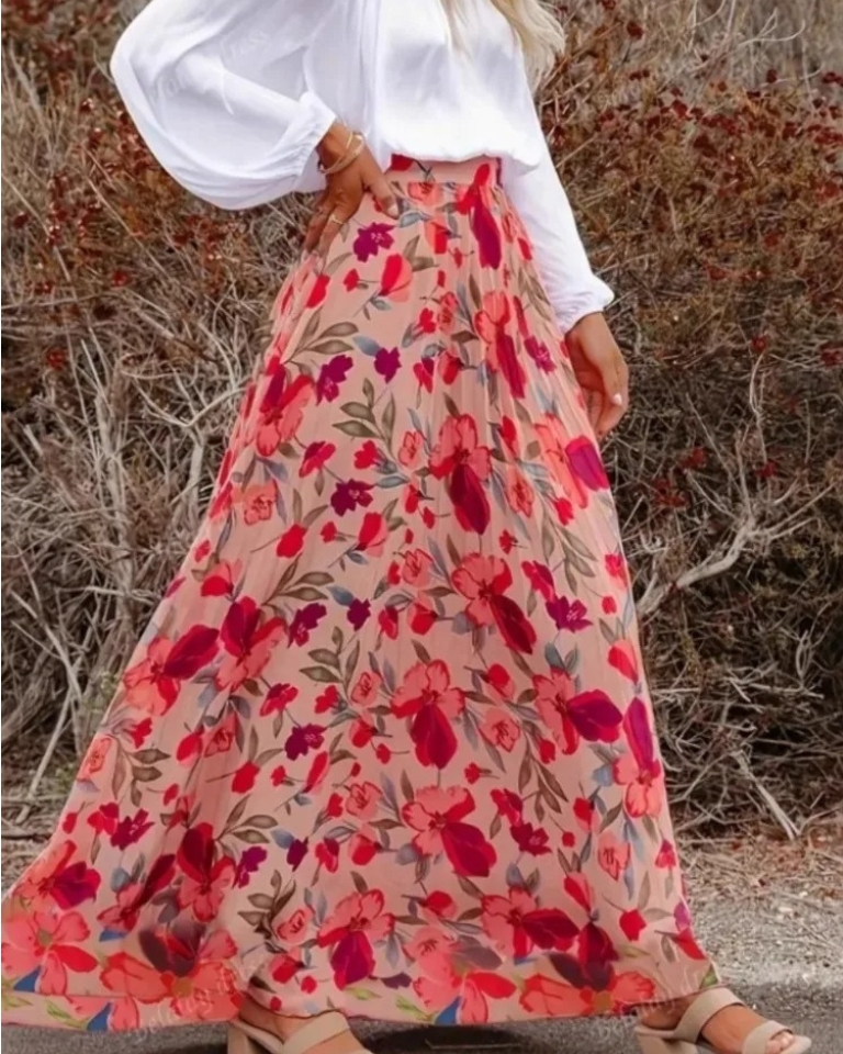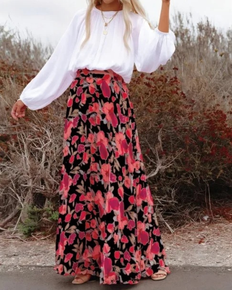 Sublimez votre style estival avec cette jupe longue bohème à imprimé floral, fluide et élégante, parfaite pour les journées ensoleillées.