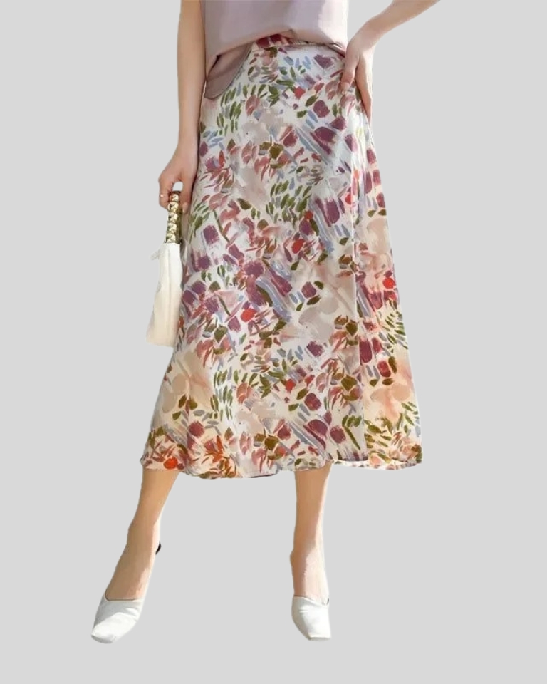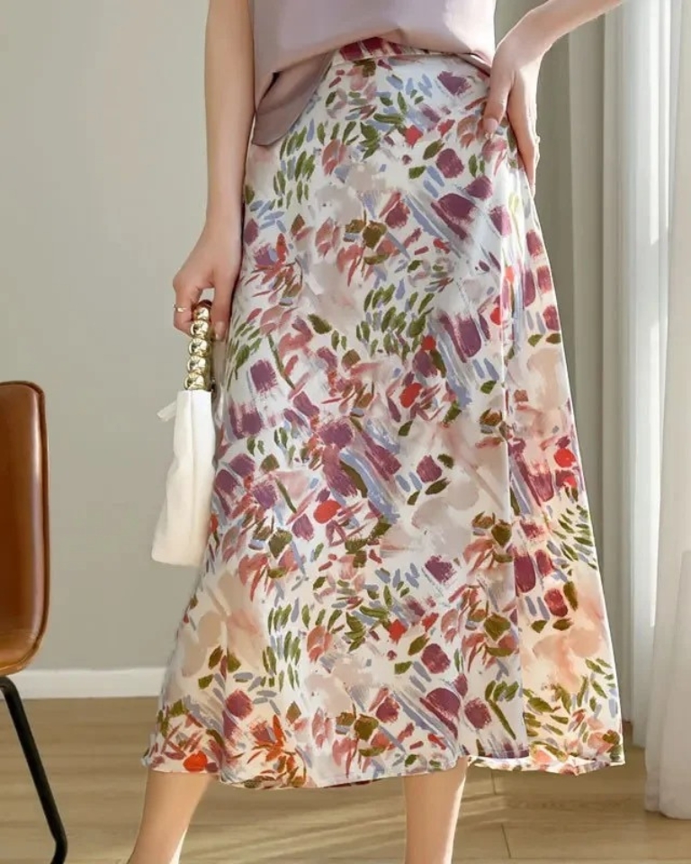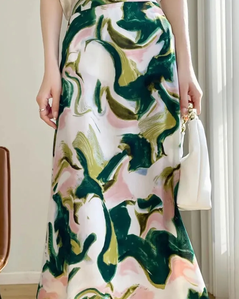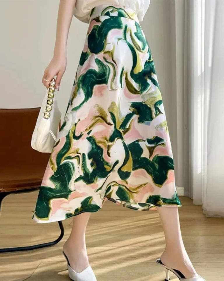 Jupe longue satinée imprimée taille haute élégante