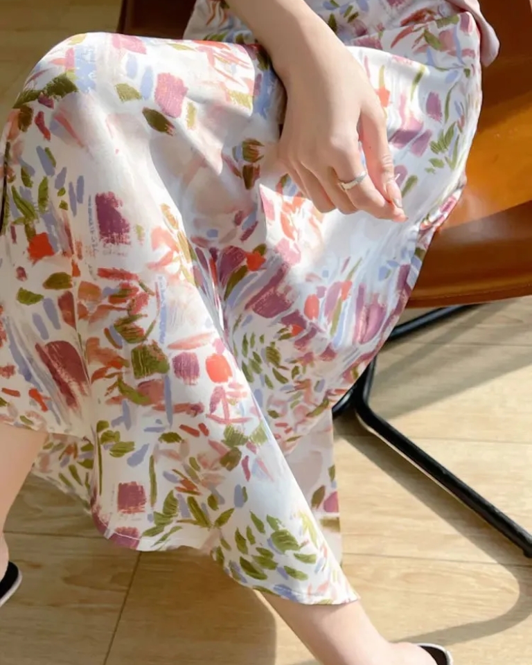 Cette jupe longue satinée capture l'élégance moderne avec son imprimé délicat et son tissu satiné qui apporte une brillance subtile et sophistiquée. La taille haute galbe la silhouette avec grâce tandis que la coupe fluide crée un mouvement élégant à chaque pas. L'imprimé romantique ajoute une touche de féminité raffinée, parfaite pour vos occasions spéciales. Portez-la avec un top ajusté uni pour mettre en valeur l'imprimé, ou avec un chemisier fluide pour une allure bohème-chic. Associez-la à des escarpins pour vos soirées élégantes ou à des sandales pour un style plus décontracté.