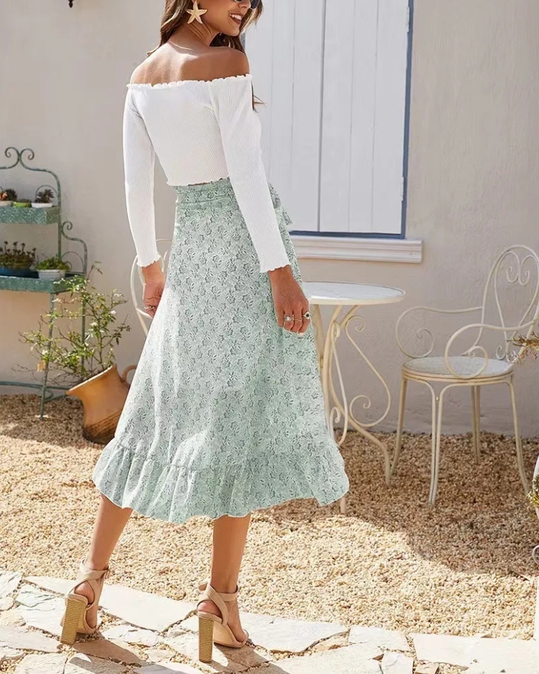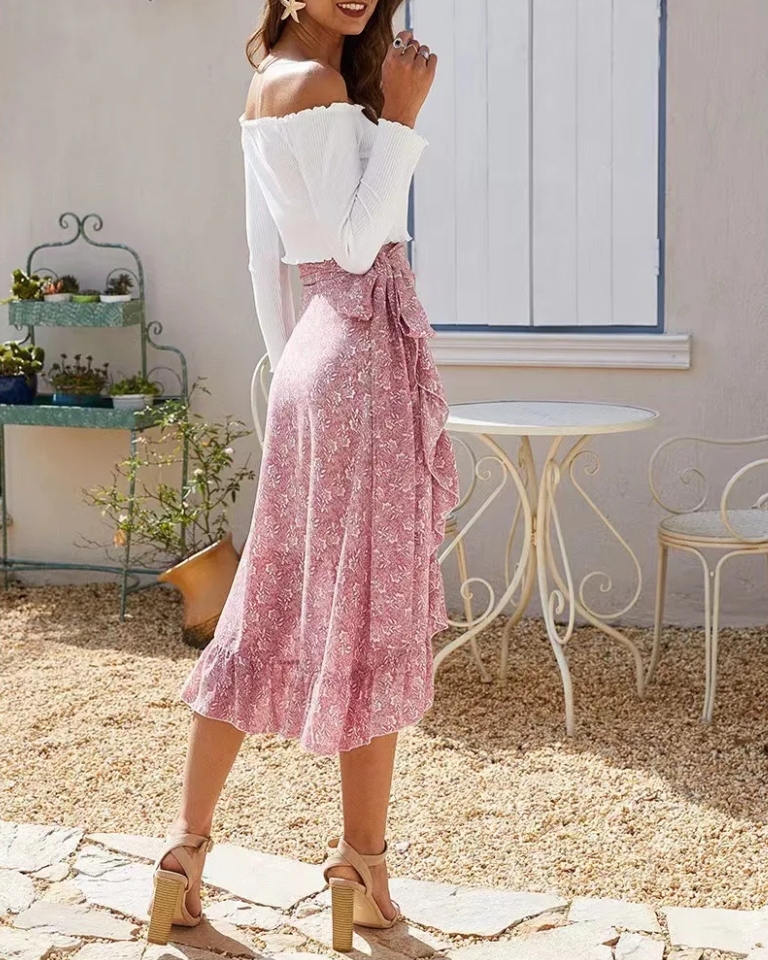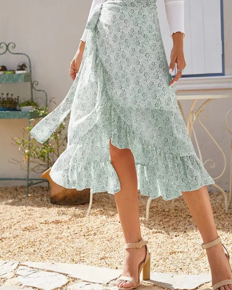 Laissez-vous séduire par cette jupe midi qui allie romance et modernité avec son imprimé floral délicat et ses volants irréguliers. La coupe fluide et la silhouette A-line épousent délicatement votre silhouette pour un effet à la fois féminin et flatteur. La fente discrète et les lacets décoratifs ajoutent une touche de charme et de mouvement à votre tenue. Parfaite pour une journée ensoleillée ou une soirée d'été, cette jupe vous transporte dans une ambiance bohème et légère, idéale pour exprimer votre style unique.