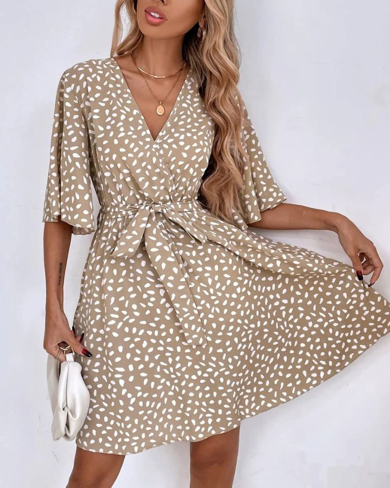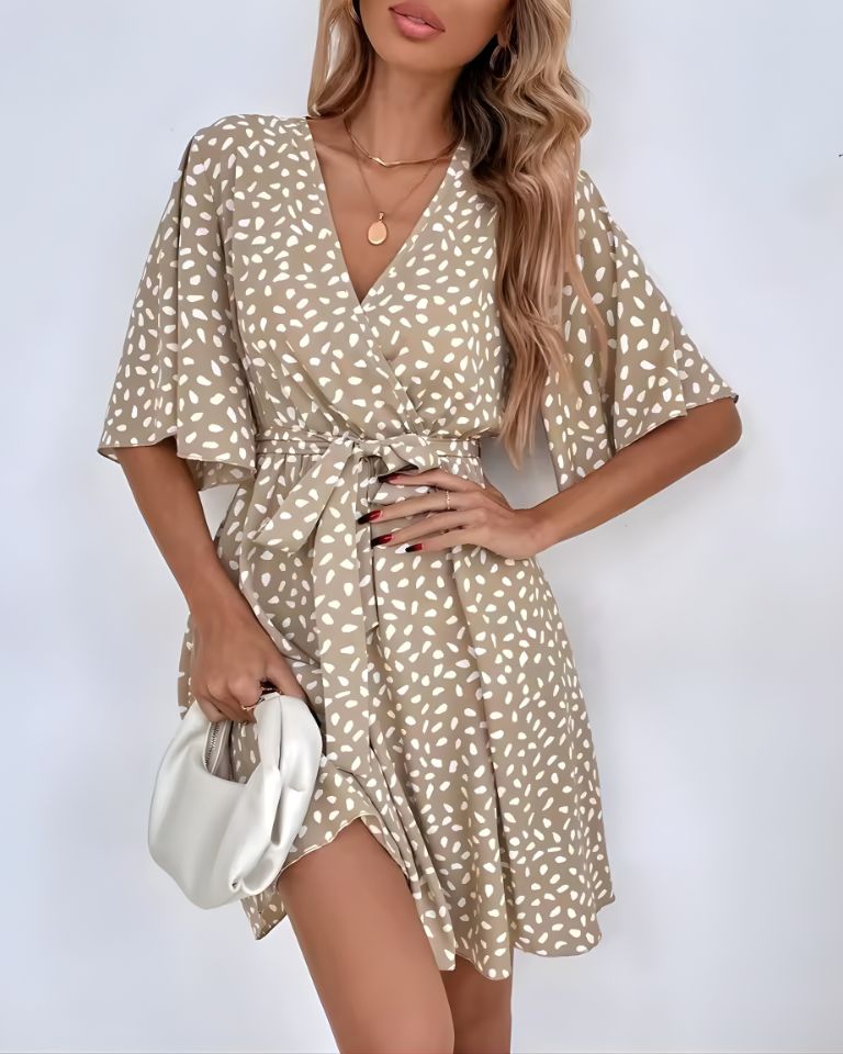 Robe courte bohème au col en V flatteur, imprimée et ceinturée à la taille pour une silhouette féminine et décontractée, parfaite pour la saison estivale.