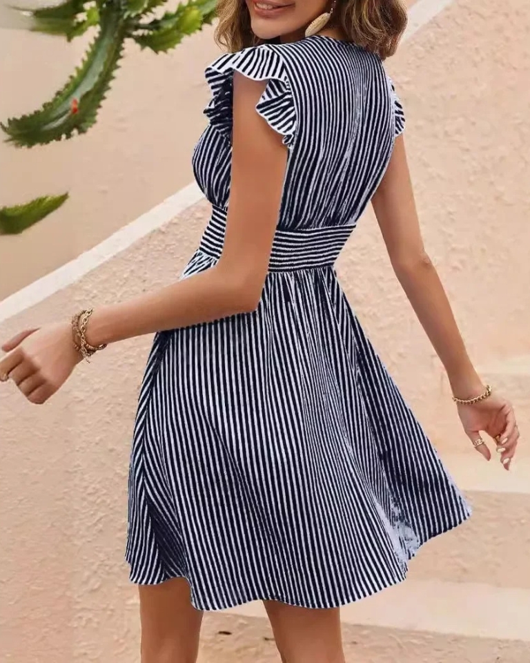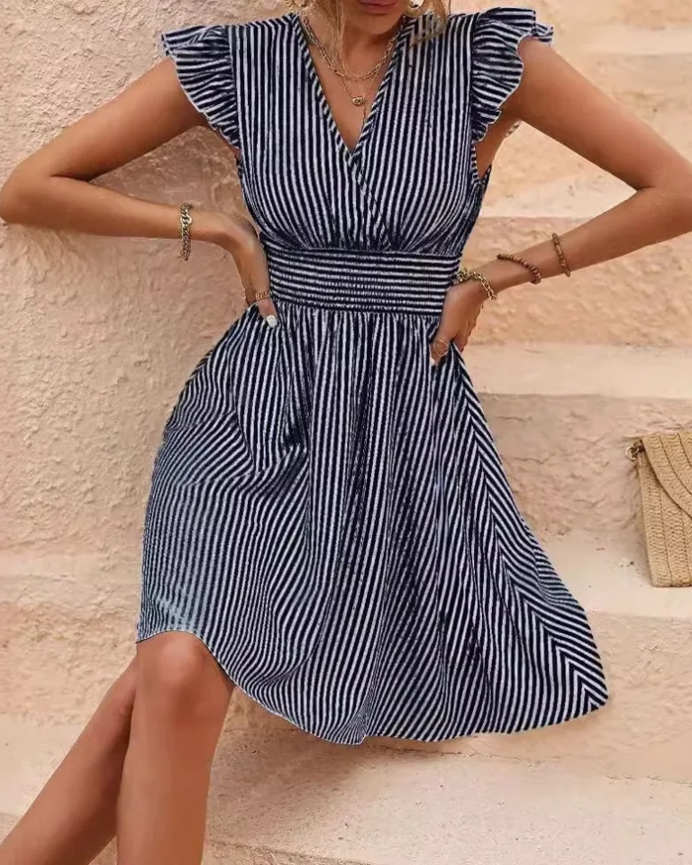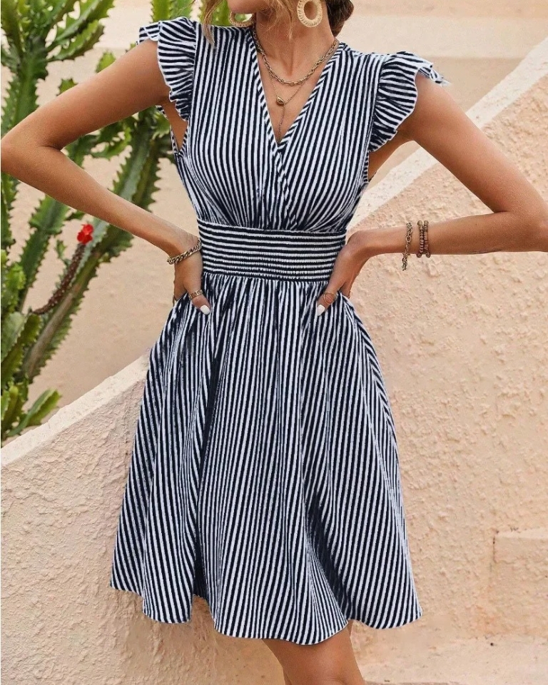 Élégante robe d’été à rayures et manches papillon pour un style frappant. Son design européen et sa coupe fluide en font la pièce parfaite pour toutes vos occasions estivales.